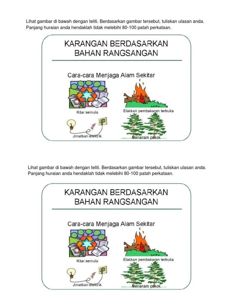 Ulasan 1 iklan menunjukkan kempen menjaga alam sekitar di negara kita. Contoh karangan kepentingan memelihara dan memulihara alam sekitar yang hijau. Antaranya, kita mestilah membuang sampah ke dalam tong sampah supaya tidak .